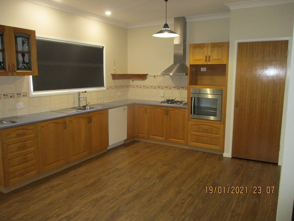 # Country stye timber kitchen featuring gas cook top with range hood, electric over, dishwasher, pantry plus plenty of cupboard space.