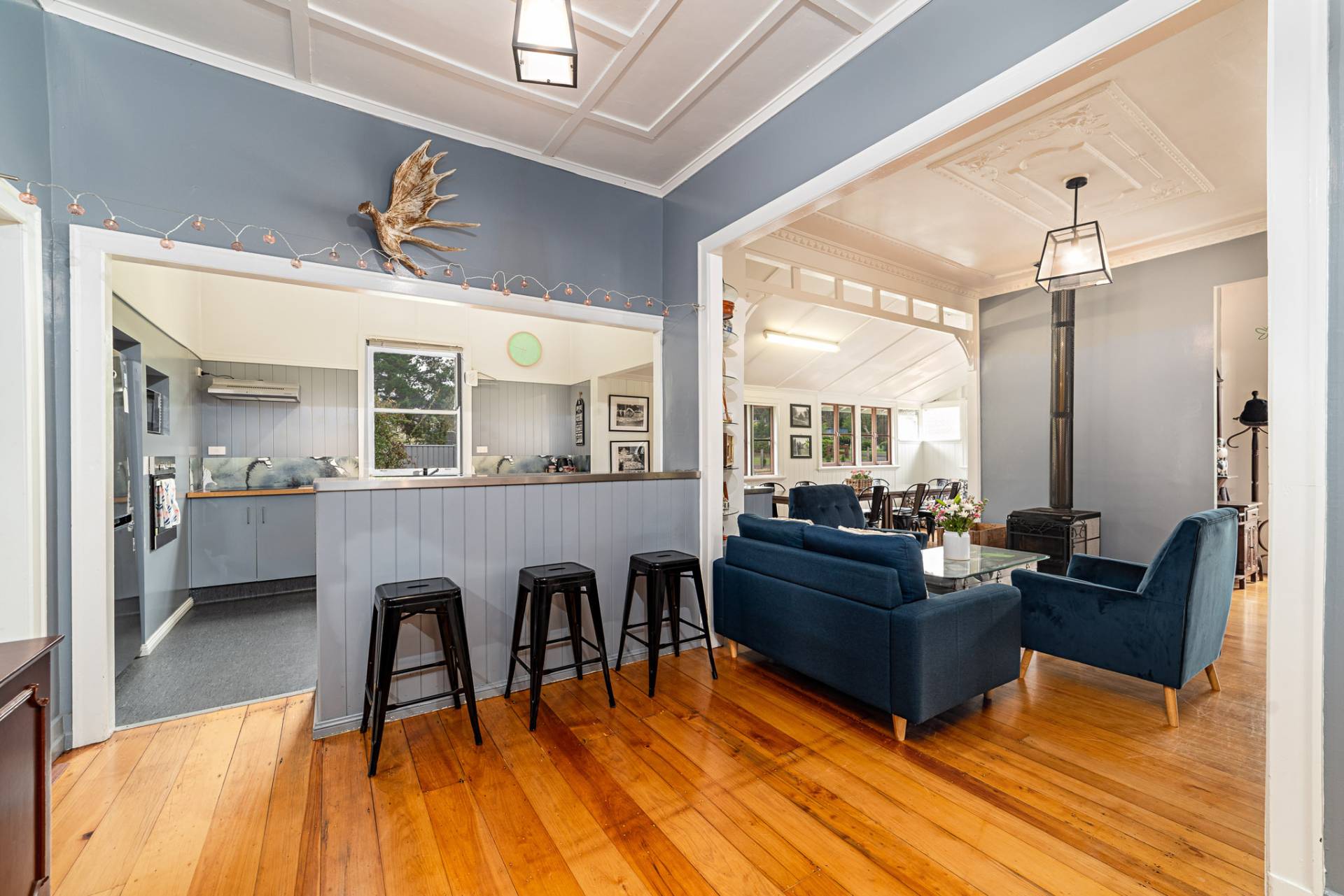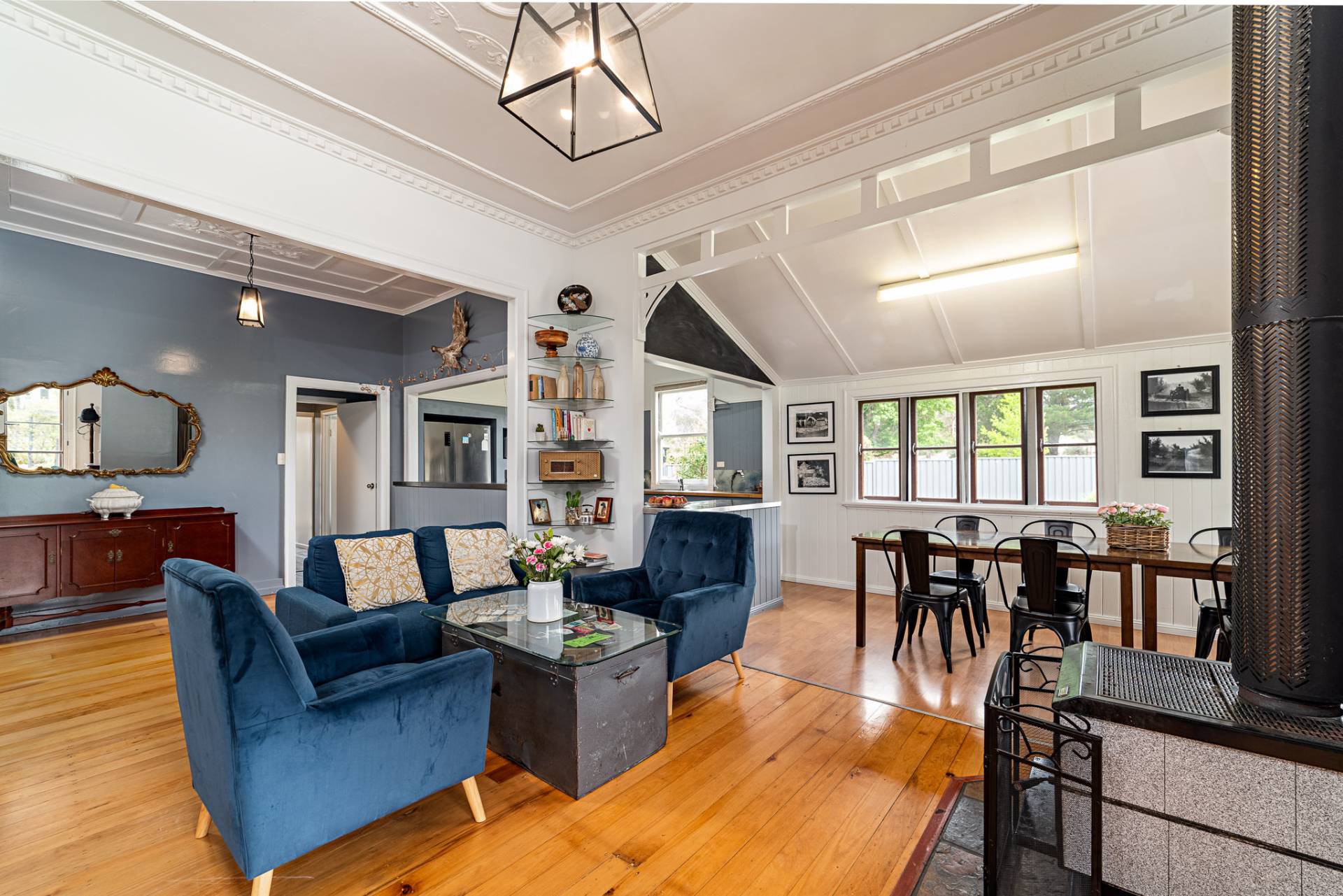 The ideal north facing paved entertainment area adjoins a spacious timber deck ideal for outdoor gatherings overlooking the gardens. This leads via silky oak double doors into an open plan living space which comprises of 3 areas to give plenty of room for everyone! The polished floorboards and high ornate plaster ceilings highlight the character of the home which is made specially comfortable with an effective wood heater plus a Fujitsu DC Inverter (approx. 2 years old) reverse cycle air conditioner for all year comfort. (Cooling – 9.4kw, heating – 10.3kw)