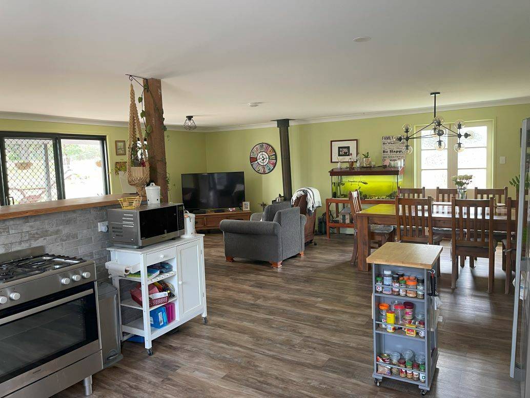# Open plan kitchen with 5 burner gas stove dining and family room approximately 8m x 6.5m which includes wood fired heater opens onto front and side patios.