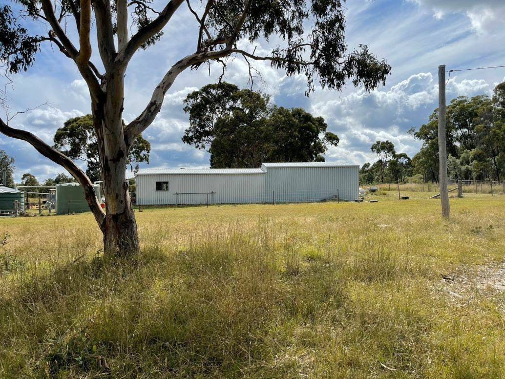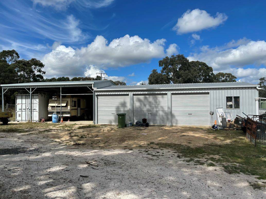 # Steel shed comprises 3 open bays 3 lock up bays plus workshop area, concrete floor plus power connected.