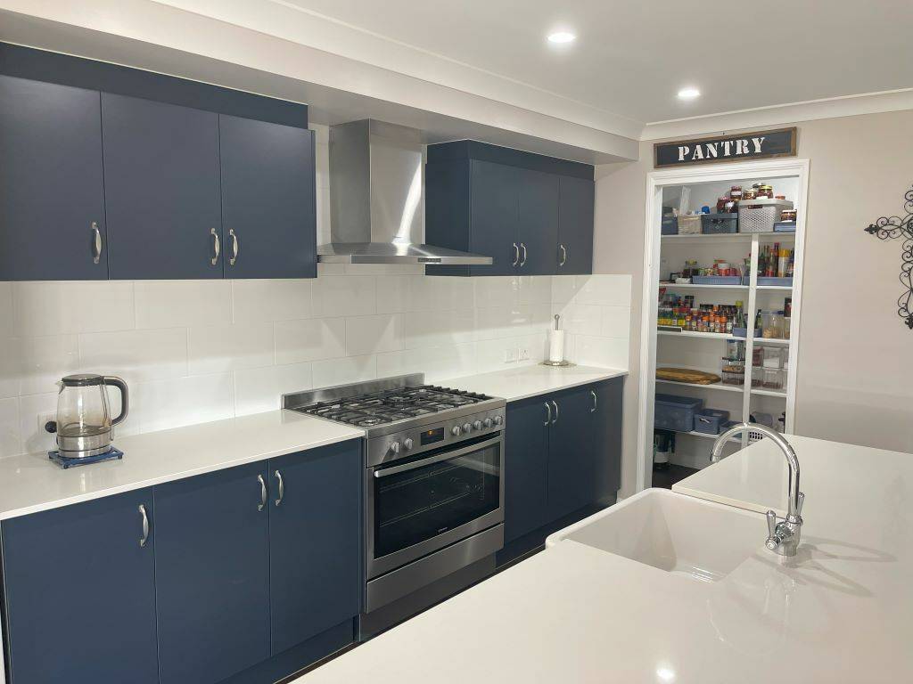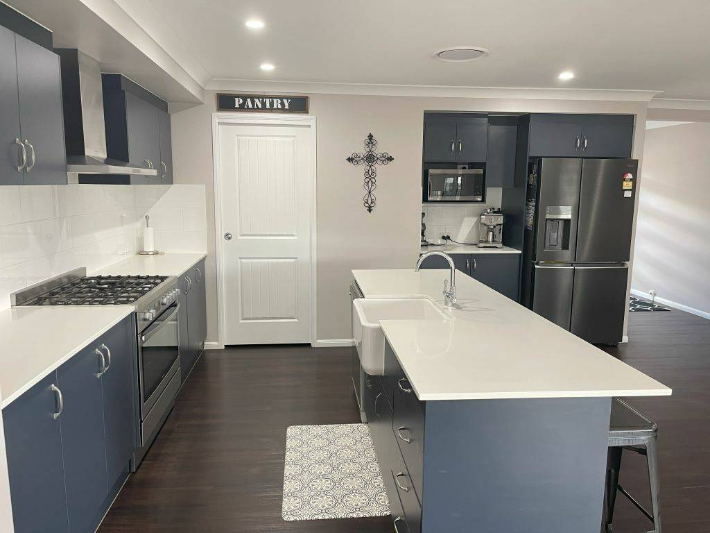 # Open plan kitchen very well appointed with plenty cupboard space, 5 burner gas cook top, dual fuel oven , dishwasher. Walk in pantry. Coffee maker nook, large refrigerator space, generous living and dining area immediately off kitchen space.