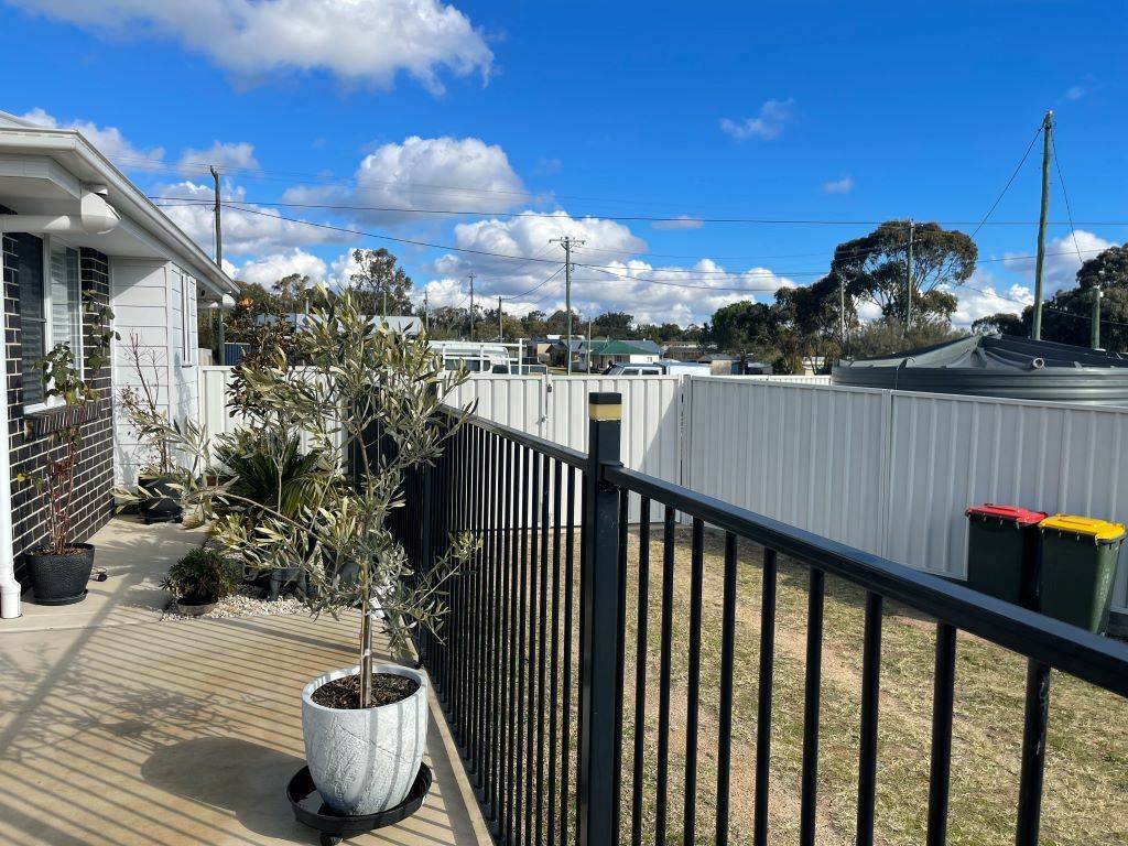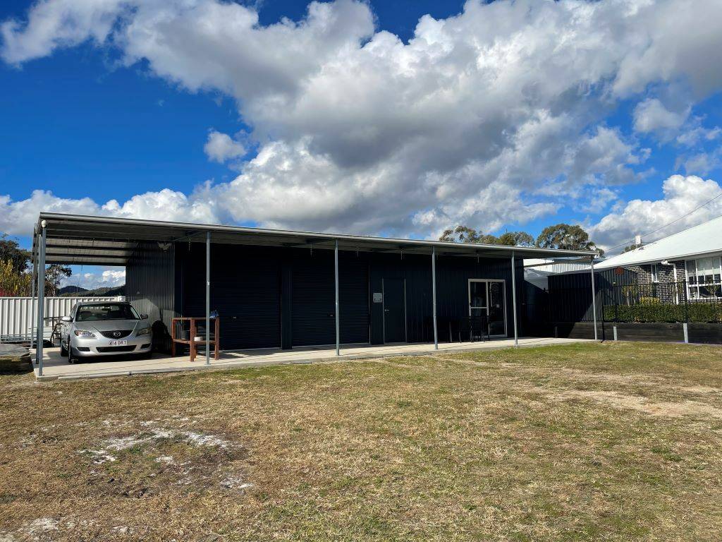 # The back yard is securely fenced and offers two street access for parking as well the 18m x 12m steel frame shed which includes one open bay, 2 bays with roller doors one with personal door entrance. Purpose Built Area suitable Full Gym Facility or Storage 3 metre awning. 3 rainwater tanks store 75,000 litres for house and garden use.