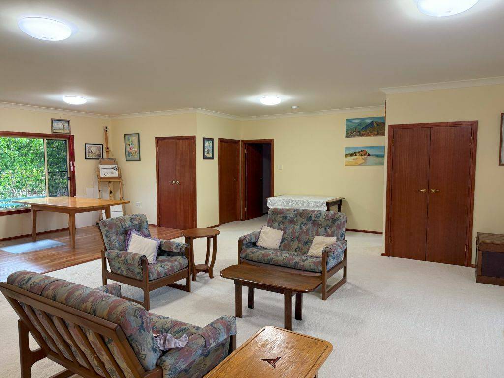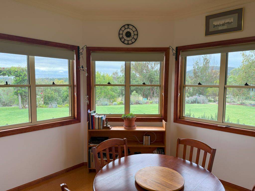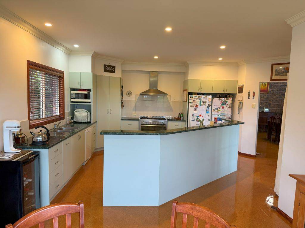 # The home has been especially designed to capture the view and winter sun while avoiding the hot summer sun. Very few homes have a setting such as this. The kitchen area captures as much sunlight as possible and includes a breakfast area, an abundance of bench and storage space along with a 5-burner gas/ electric stove. Formal dining area leading into lounge room onto family room.