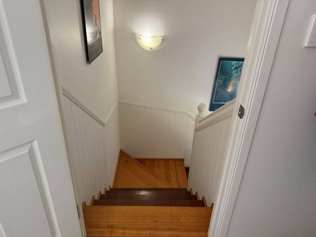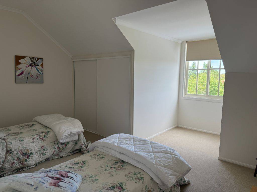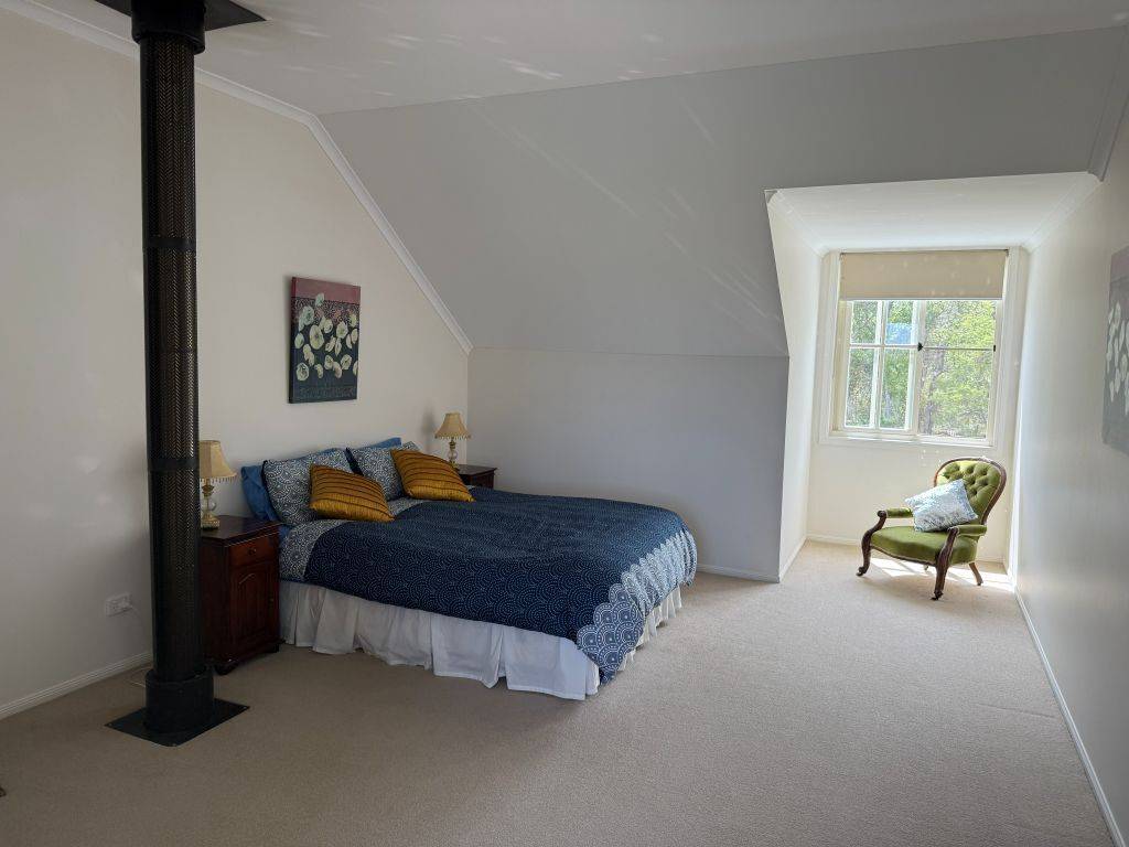 The upper level includes 2 bedrooms a generous living area and the second bathroom all with Tudor windows. The wood fired heater in the living room also supplies heat to these areas.