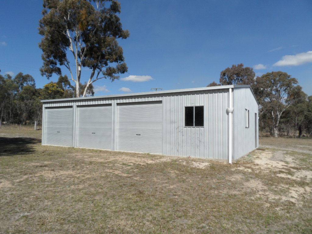 Out building comprises a 12m x 7m lock up garage with3 roller doors and power connected.
